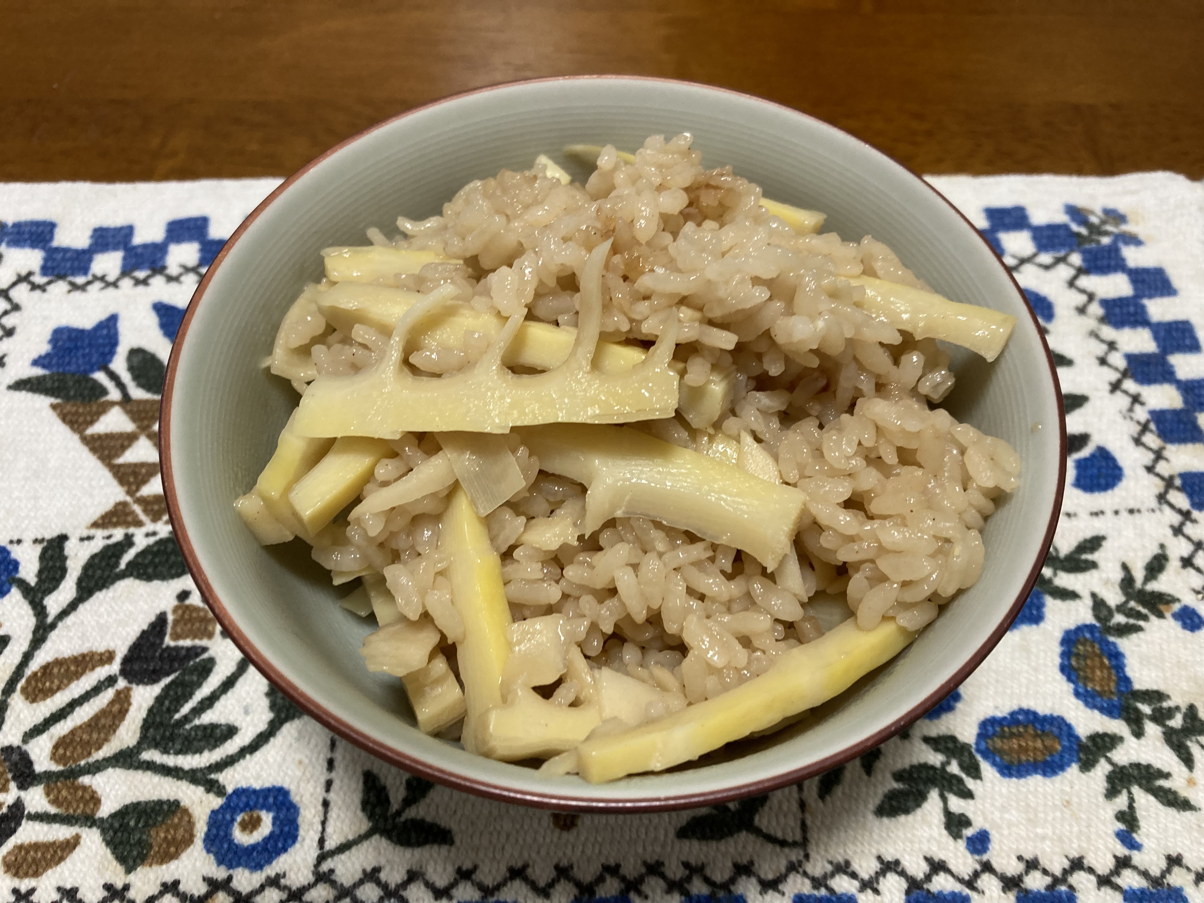 昨夜のうちにアク抜きをして、冷蔵保存しておいたので、タケノコご飯をつくった。