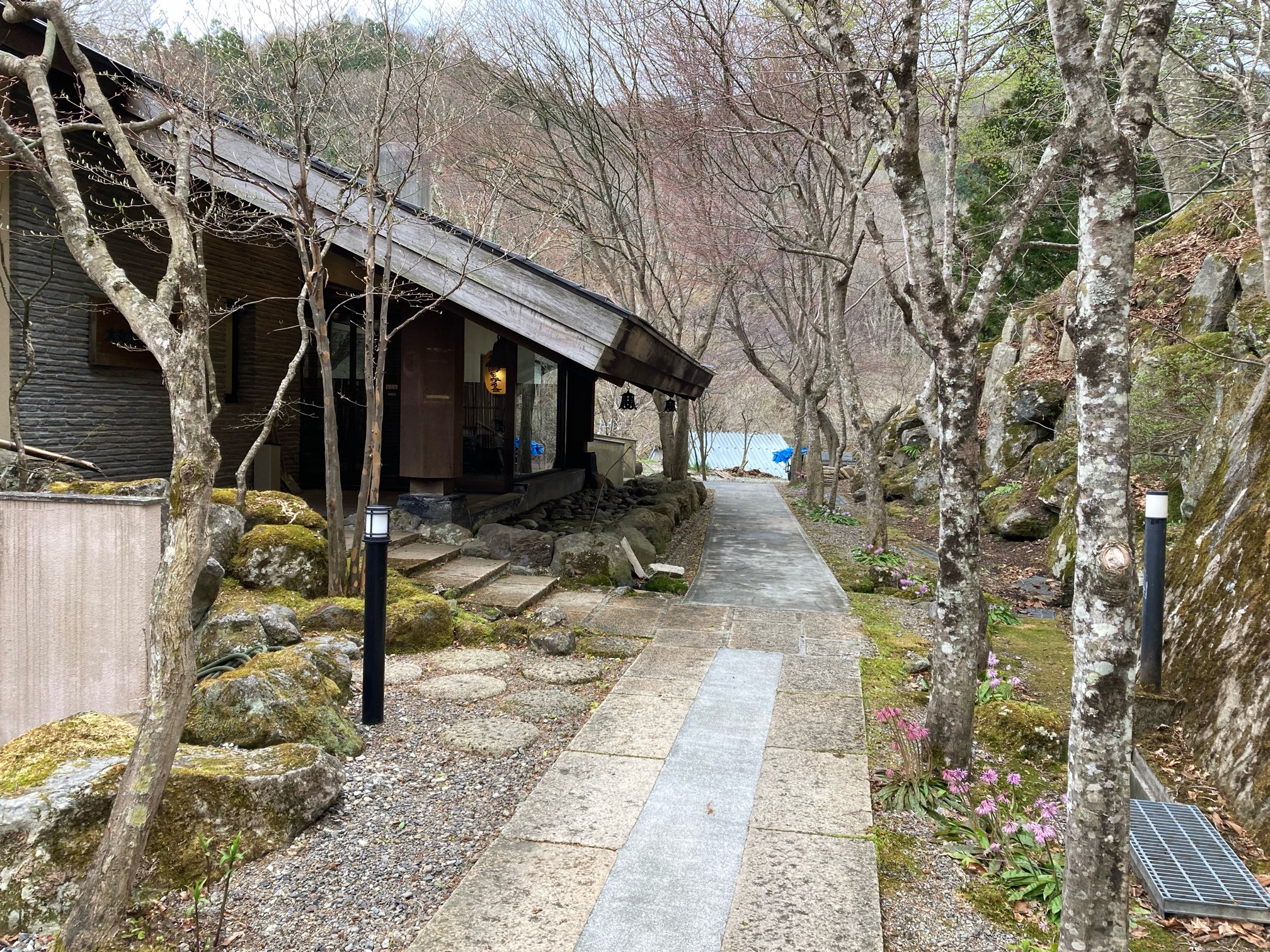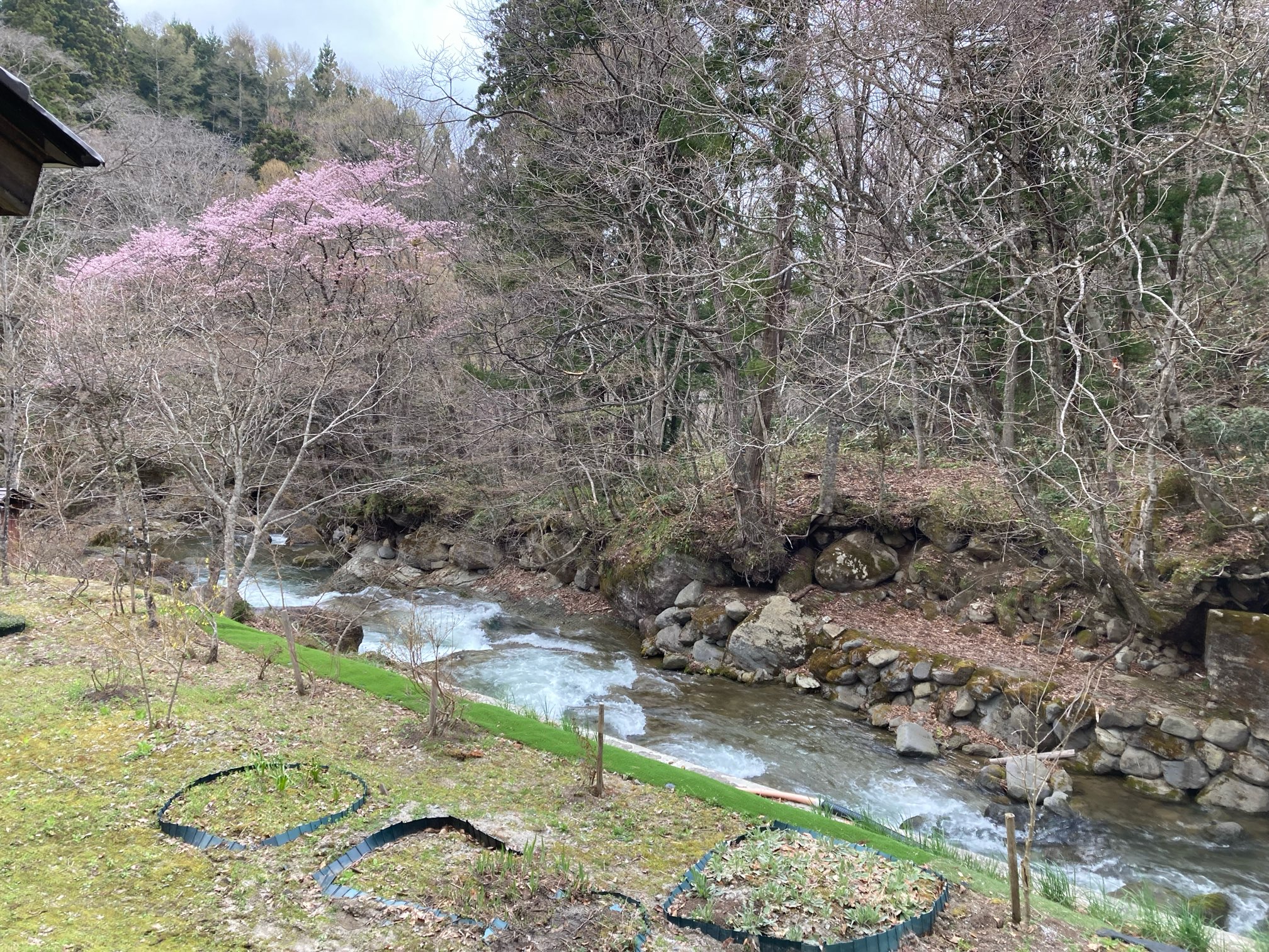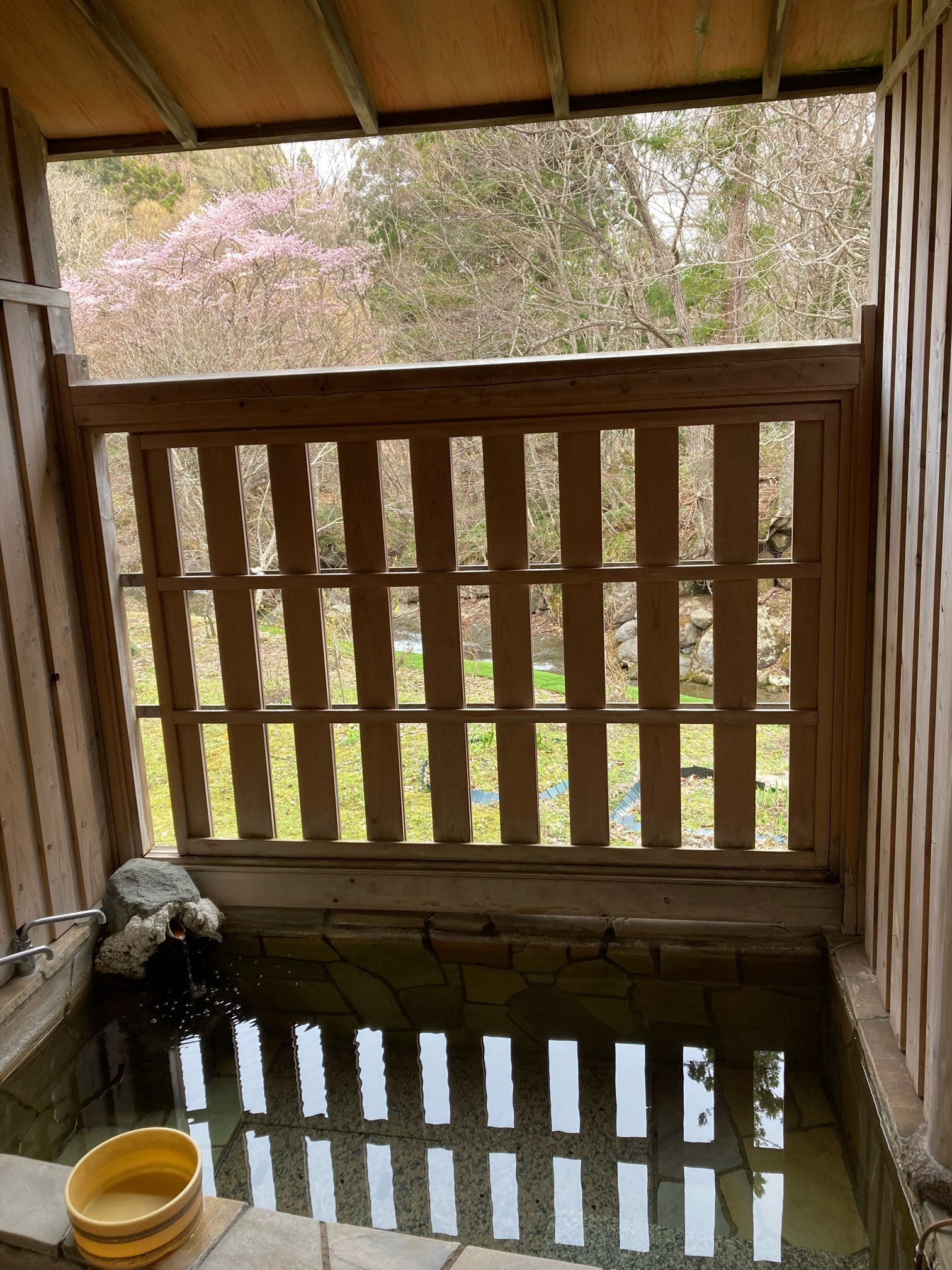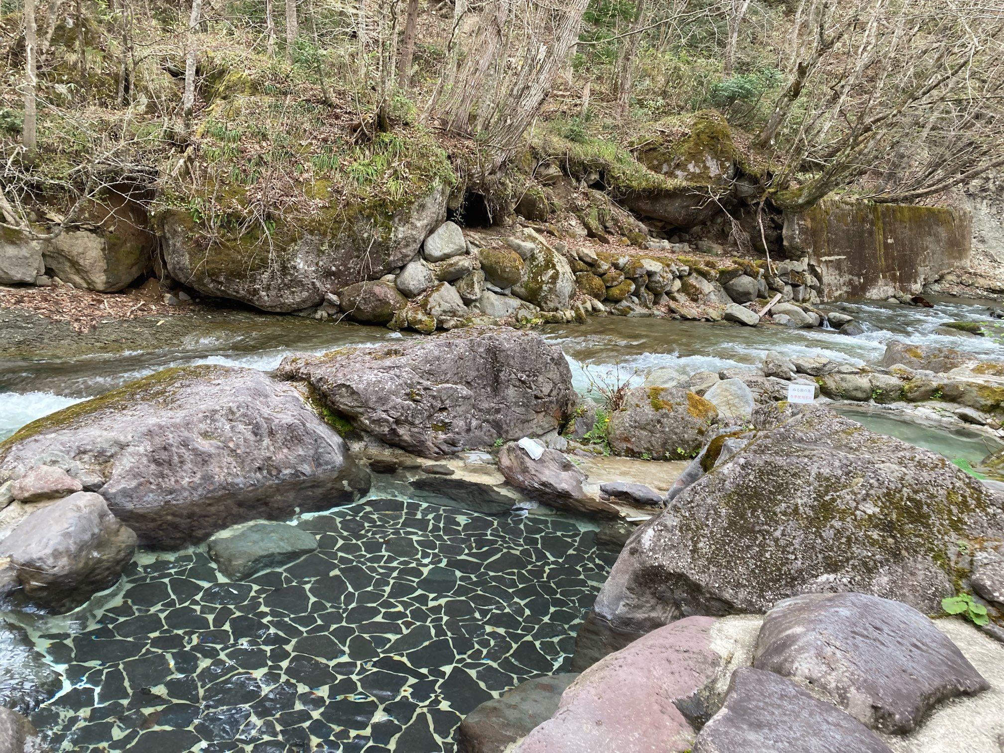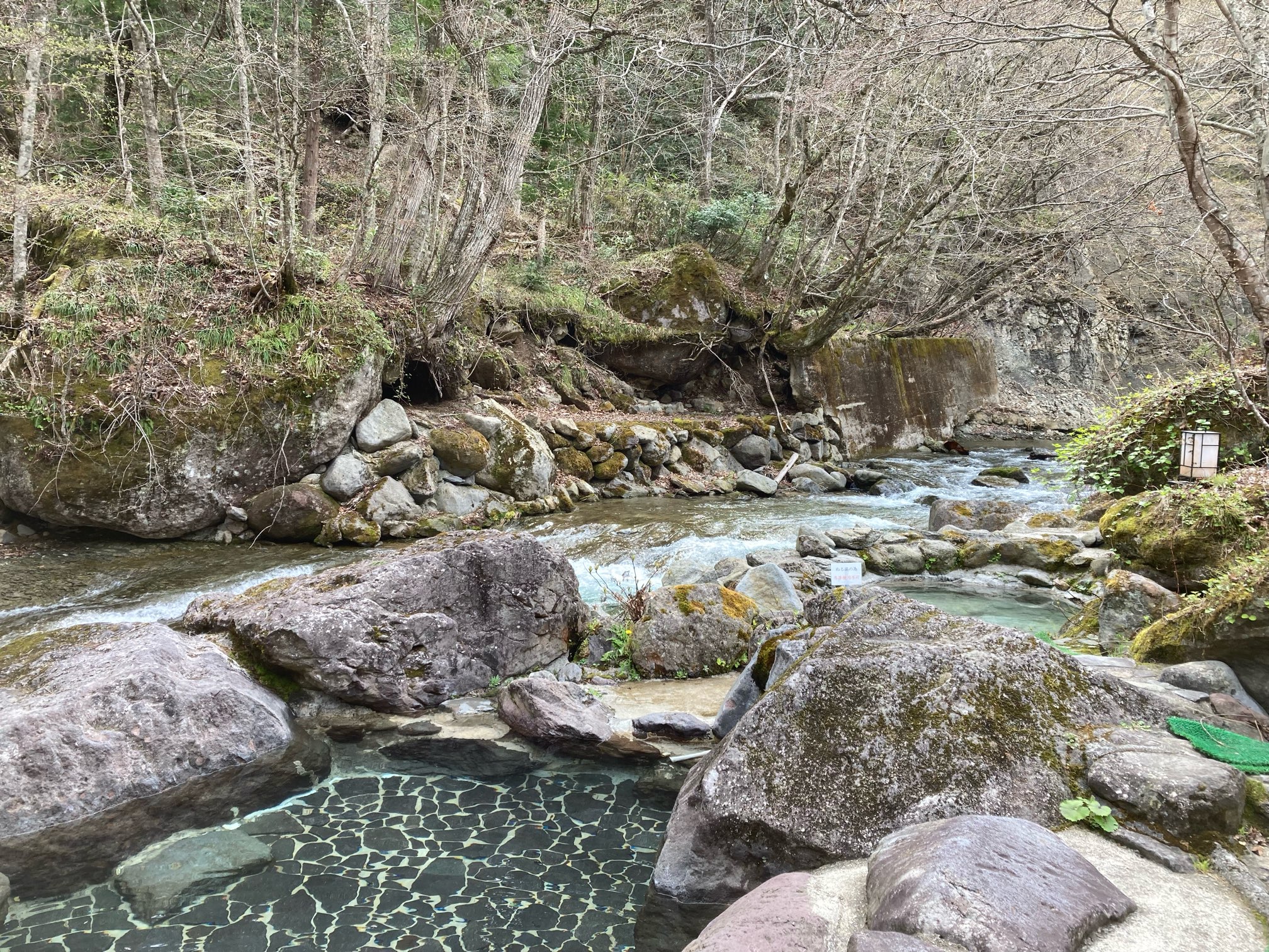 ますは渓流沿いの露天風呂へレッツゴー。竿を出せば釣りができそう。