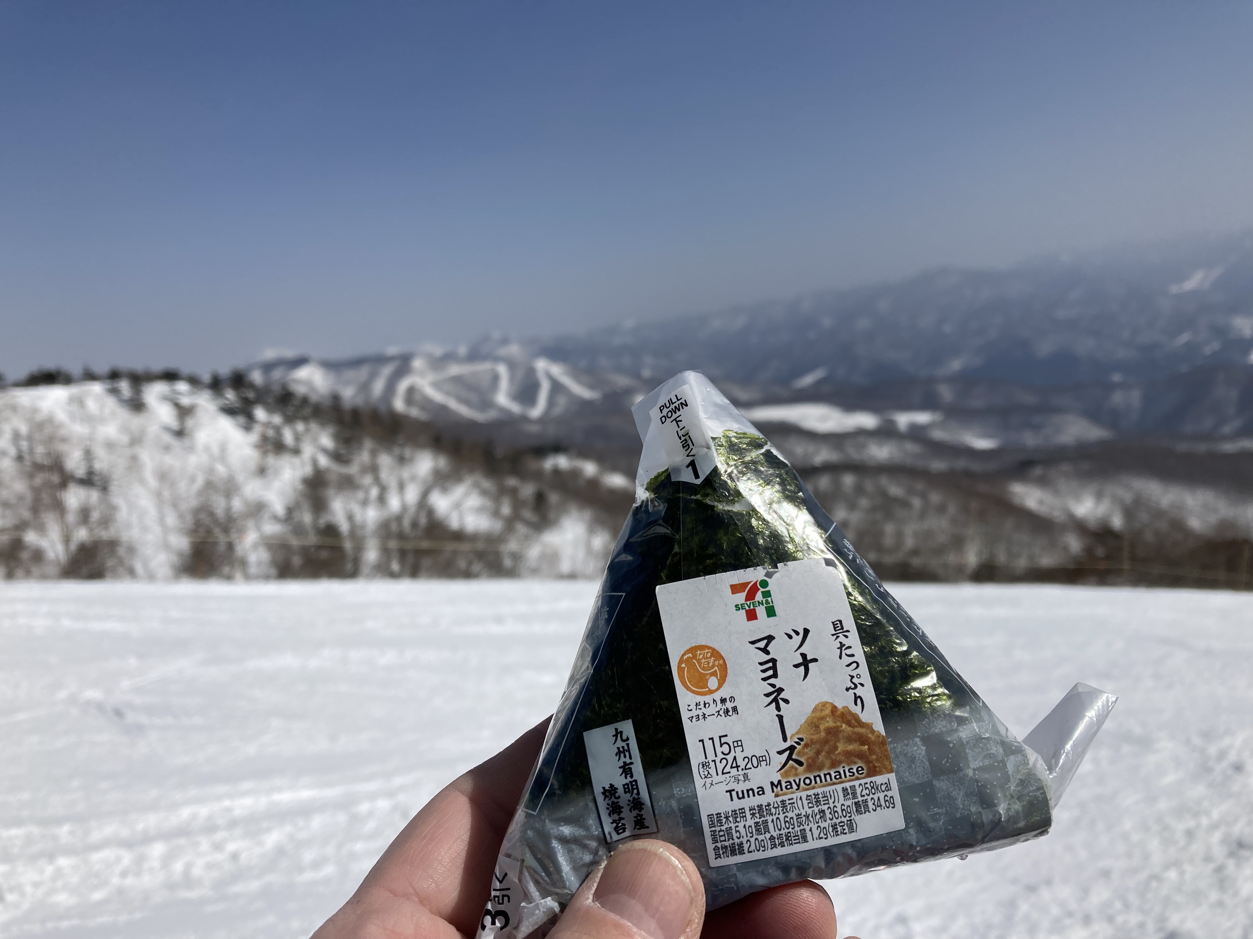 しばらく滑ったら小腹が減ったので、山頂でおにぎりを食べることにした。絶景とおにぎり最高。